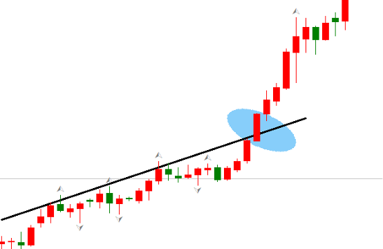 等待突破之后做单的策略,无可避免的需要对有效突破做出定义。这里介绍笔者常用的确认有效突破的方法。当第一根阳线突破阻力线,且收盘价位于阻力线之上时,下一根K线突破这根K线的高点,则确认有效突破。支撑线的有效突破同理,如下图: